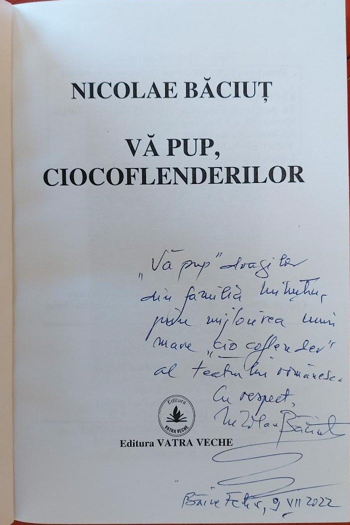 „Vă pup, ciocoflenderilor”, cartea domnului Băciuț, pe care am avut ocazia să o citesc recent, este un elogiu adus marelui actor și se înscrie, în opinia mea, printre cărțile document care vor rămâne peste timp. Este o reverență pe care autorul cărții o face în fața marelui actor, cinstindu-l. Printr-o reacție reflexă facem și noi același lucru, atât în ceea ce privește legendara figură a lui Florin Piersic, cât și în fața omului care a realizat la ceas aniversar, acest omagiu scris. Și nici nu ar putea fi altfel pentru că, așa după cum afirmă autorul, „Noi suntem parte din acel public, pe care Florin Piersic l-a iubit, îl iubește și căruia i s-a dăruit cu toată viața sa.” (Nicolae Băciuț)