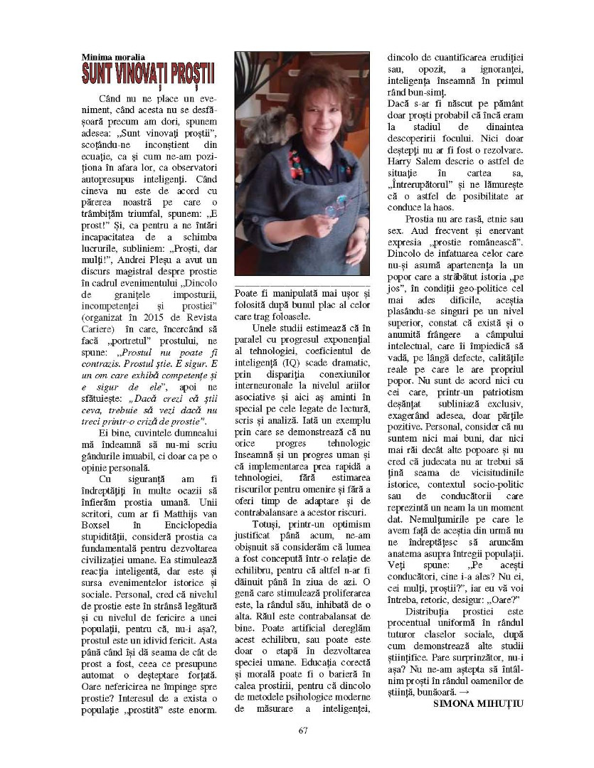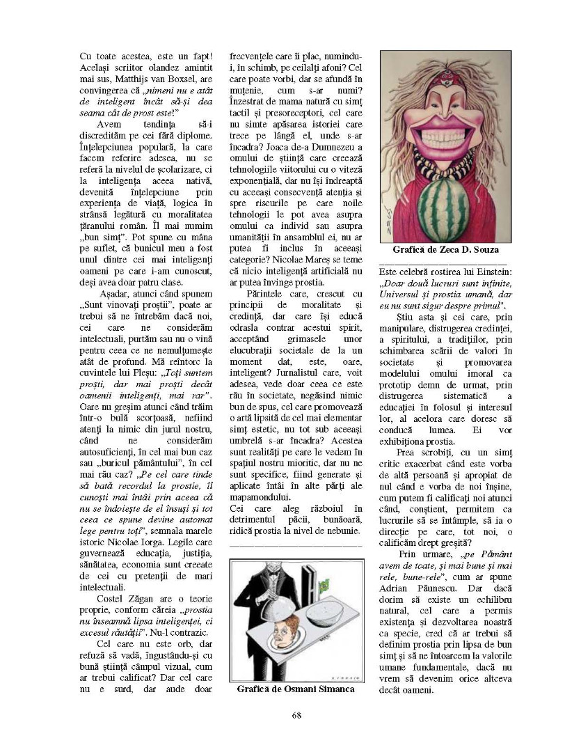 Prostia nu are rasă, etnie sau sex. Aud frecvent și enervant expresia „prostie românească”. Dincolo de infatuarea celor care nu-și asumă apartenența la un popor care a străbătut istoria „pe jos”, în condiții geo-politice cel mai ades dificile, aceștia plasându-se singuri pe un nivel superior, constat că există și o anumită frângere a câmpului intelectual, care îi împiedică să vadă, pe lângă defecte, calitățile reale pe care le are propriul popor. Nu sunt de acord nici cu cei care, printr-un patriotism deșănțat subliniază exclusiv, exagerând adesea, doar părțile pozitive. Personal, consider că nu suntem nici mai buni, dar nici mai răi decât alte popoare și nu cred că judecata nu ar trebui să țină seama de vicisitudinile istorice, contextul socio-politic sau de conducătorii care reprezintă un neam la un moment dat. Nemulțumirile pe care le avem față de aceștia din urmă nu ne îndreptățesc să aruncăm anatema asupra întregii populații. Veți spune: „Pe acești conducători, cine i-a ales? Nu ei, cei mulți, proștii?”, iar eu vă voi întreba, retoric, desigur: „Oare?”